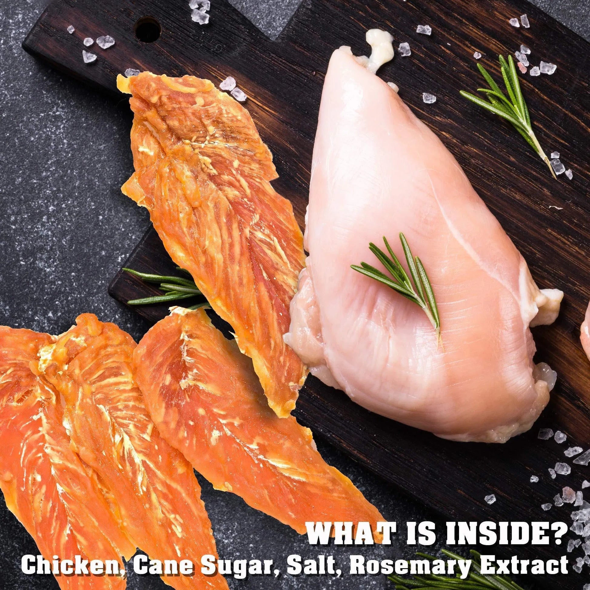 - chicken jerky made of 100% chicken meat: you need to let your dog enjoy high quality natural and healthy food. it is right to choose our product. dog chewies are perfect for training, these top jerky will last a long time and can special promote dogs' teeth healthy. have less plaque and tartar. keeps dogs' jaws strong and breath fresher.