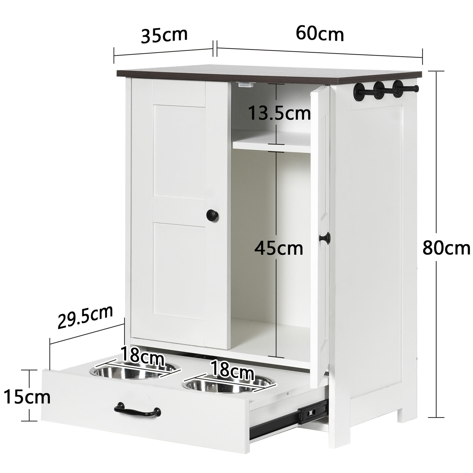 - 2,DETAIL DESIGN: Compared with other feeding dog bowls, our dog feeding station has three hooks on the side for hanging pet collars and dog leashes. This dog feeding station can store pet supplies, pet food, and pet toys. With this dog food storage cabinet, you no longer have to worry about a messy room.