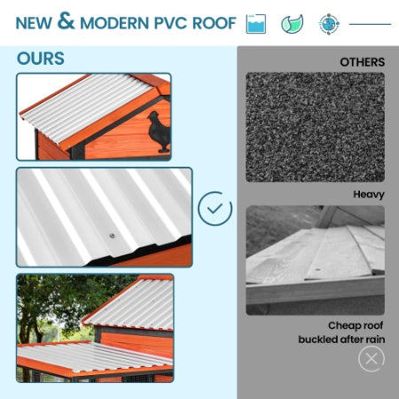 Sturdy Construction: Featuring high-quality wood and a metal frame, this coop is much more durable than traditional wooden frames. Designed to resist the natural elements, it provides a safe and secure home for your chickens. Spacious and Comfortable: This coop includes a large nesting box with dividers, offering ample space for 5-7 chickens to move, rest, and roost. The extended run area allows for perching and roaming, making it a comfortable habitat for your poultry. Predator-proof Security: The solid, thick iron wire mesh and lockable doors keep predators at bay, ensuring the safety of your poultry day and night. Easy to Clean and Maintain: Features a built-in waterproof and moisture-proof bottom board that can be removed for washing, preventing bacterial growth and providing a dry and healthy environment for your chickens. The sleeping area comes with 2 doors that can be opened for convenient coop cleaning. PVC Waterproof Roof: The coop and runway utilize a waterproof PVC roof to prevent leaks, offering greater durability compared to other materials with only wooden roofs. Excellent Ventilation System: The sleeping area’s transparent window design promotes healthy living conditions by facilitating airflow and natural light. Windows can be closed in winter to prevent the cold and opened in summer for cooler air. Note:This chicken coop is packaged in 2 boxes. Ensure that both boxes have arrived before proceeding with assembly.