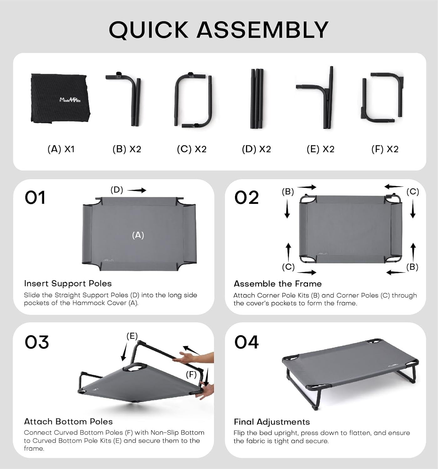 - Tool-Free, Hassle-Free Setup - No screws or tools needed-just slide and click.The plug-in design allows for fast, frustration-free assembly.Whether you're at home or packing for a trip, this easy-to-assemble elevated dog bed sets up in minutes