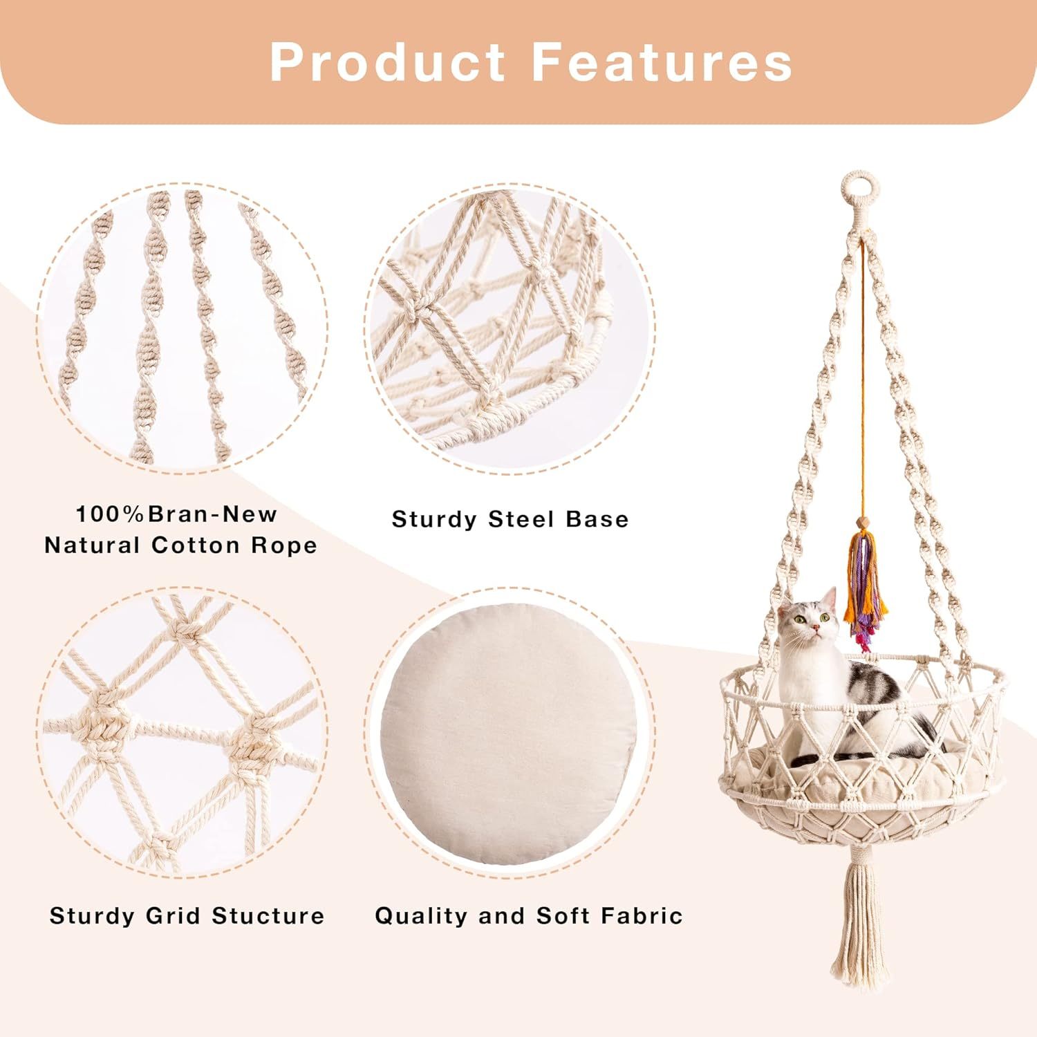- Sturdy: Boho macrame cat hammock bed is made of 100% natural high-quality cotton rope,the rope is thick and soft, with a long front and a short back, stable double steel hoop base, The bottom of the hanging cat bed is supported by a metal frame, it can keep balance and reduce swing, it's very safe for your cats.