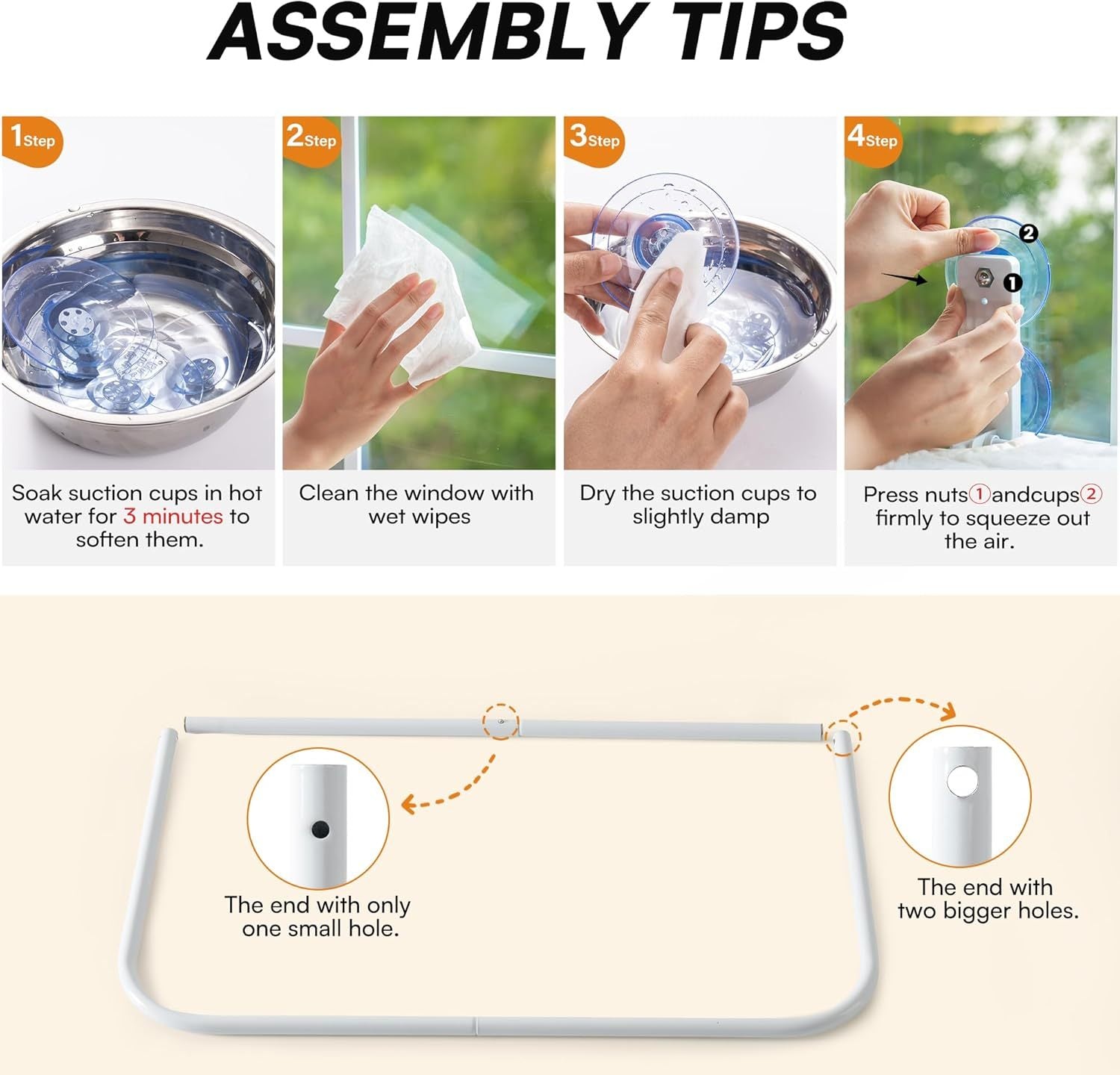 - Pre-Installation Tips:Soak the suction cups with hot water for 3 minutes to soften them before sticking them to the window. Clean the window after drying them until they are only slightly damp. Apply the suction cups to the window and firmly press to remove the air
