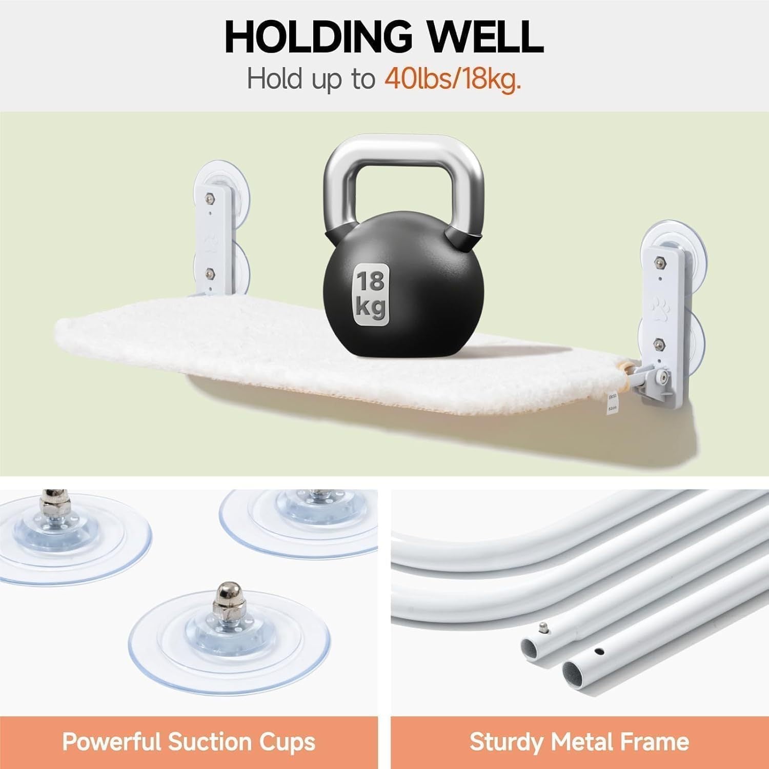 - Quality Materials:Instead of plastic, the frame is composed of quality steel, and the large suction cups keep the cat window bed firmly in place. It can support up to 40 pounds and is reversible