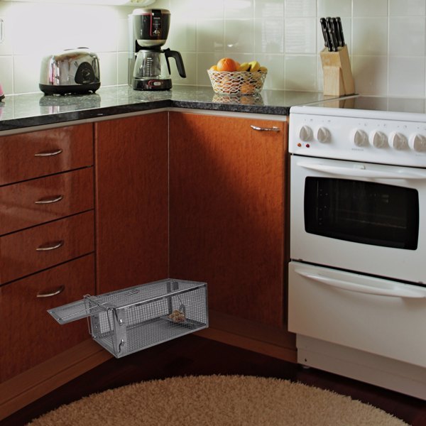 This is a sturdy and fantastic humane mouse or critter trap. You set the trap from the outside of the cage. Then drop some sunflower seeds through the top of the cage without having to put your hands inside no matter when used indoor or outdoor, or bait it with snacks attractant to trap voles, squirrels, chipmunks, mice, rats, weasels and other similar size animals. Additional latch followed by gravity once triggering completely prevents captive animals from escaping from the door. It is also easy to set the target caught animal free just by re-setting the trap. All sets in seconds.